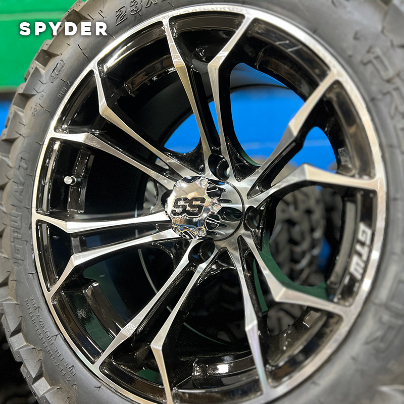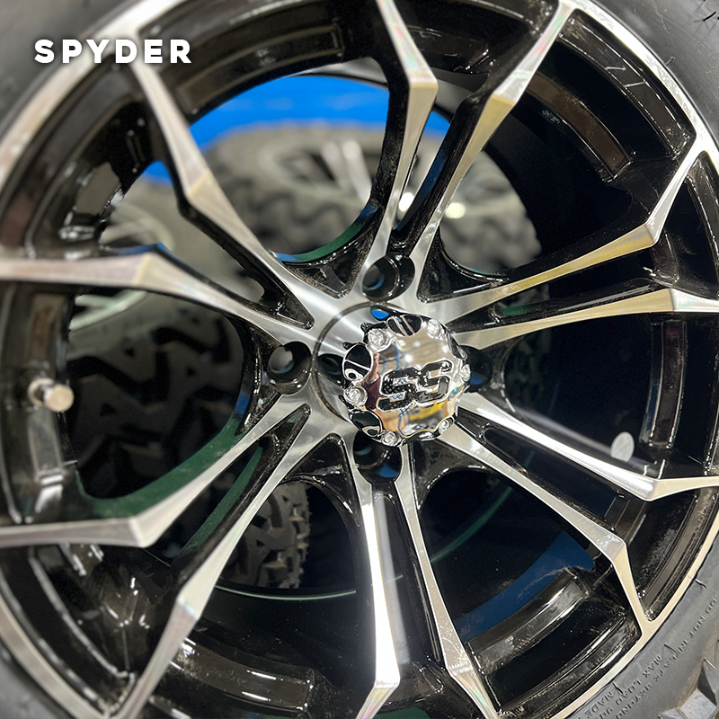 Ok, if you didn’t read the name of this golf cart rim in the voice of Will Ferrel as Megamind, maybe your kids are older or hate cartoons ha ha ha. The “SPY”der rim takes the five-bar pattern to the next level by branching off each bar into a “V” at the rim base. These rims are really cool and make a better impression in person. They have a slight “outbowing” to the design which you can see from the front of the rim.